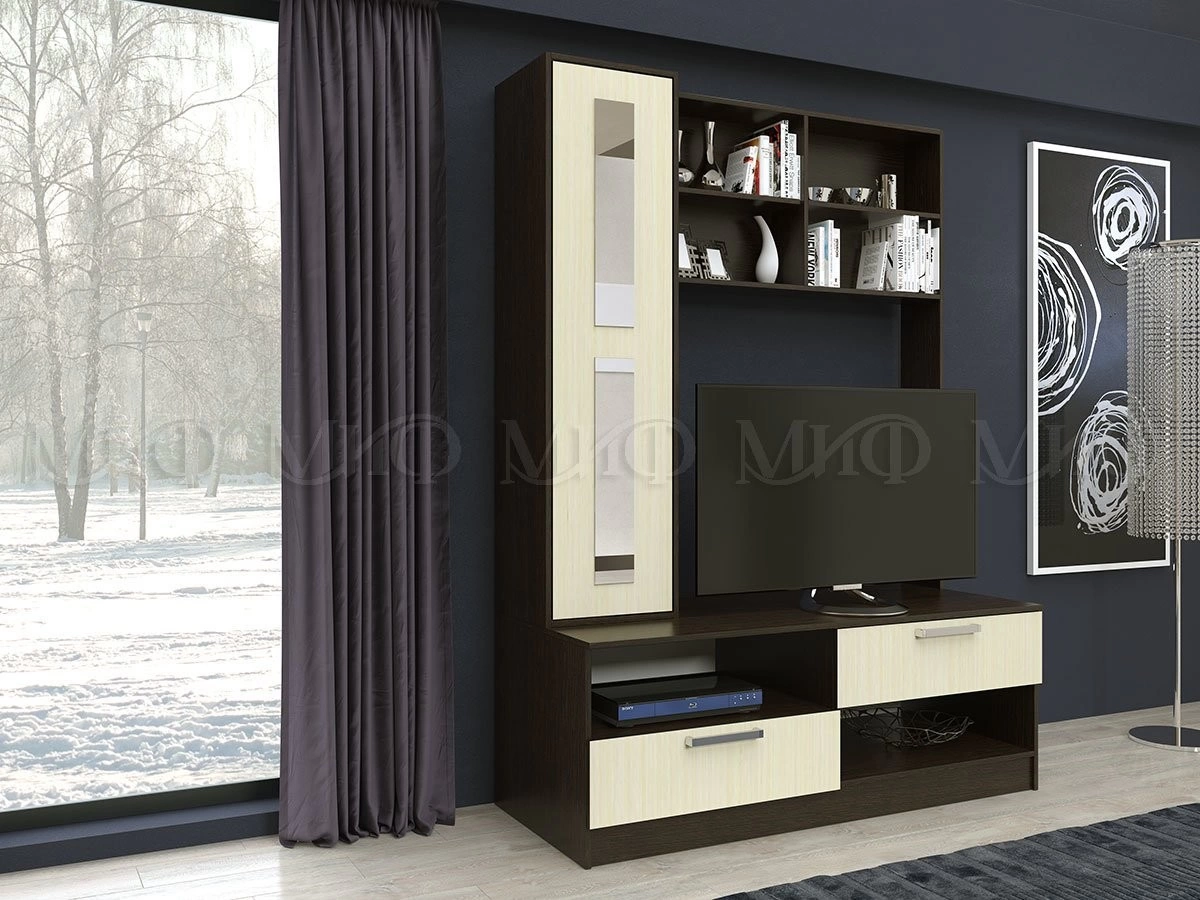 Геометрические формы, лаконичный стиль и необходимая функциональность - главные достоинства центральной секции гостиной «Фиджи». Мебель может использоваться как самостоятельная мини-стенка, так и в наборе модульной системы «Фиджи». У нас можно купить недорогую мини гостиную.