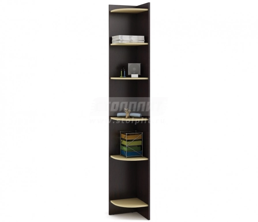 Узкий торцевой стеллаж с открытым фасадом изогнутой формы. Гнутый фасад данного стеллажа смягчает острый угол мебельного гарнитура, облегчая интерьер, при этом он является вместительной и функциональной системой хранения и позволяет вам с удобством разместить все необходимые вещи. Имеет шесть полок.