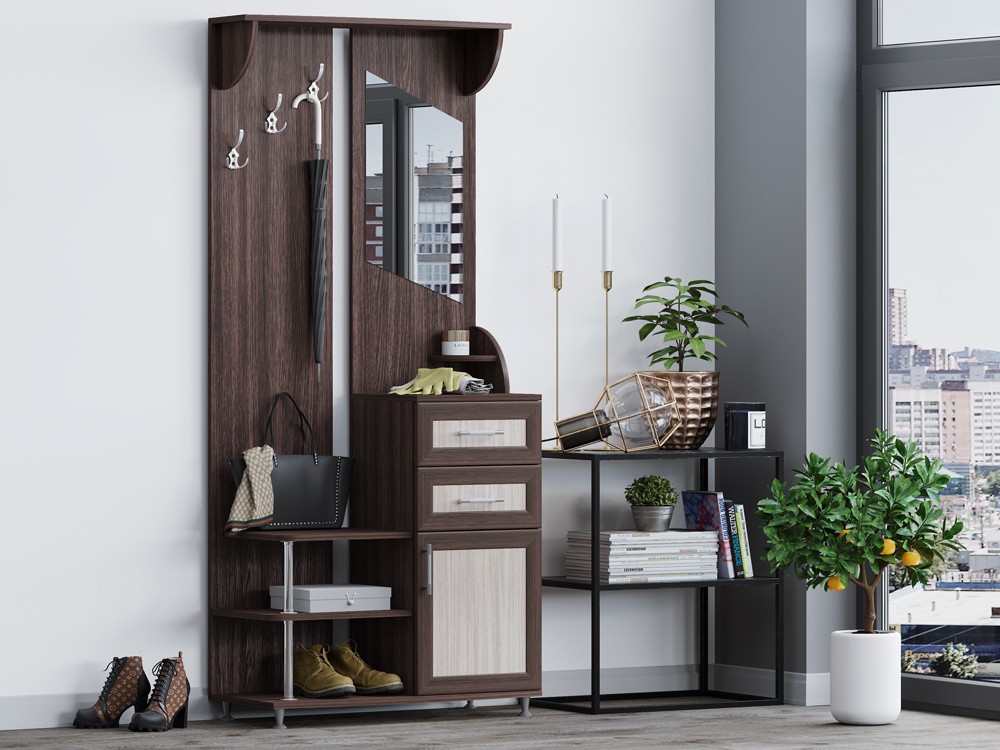 Аккуратная прихожая "Юлианна" представляет собой панель тёмного шоколадного цвета, на которую с одной стороны крепятся три больших трёхрожковых крючка для одежды, а с другой зеркало оригинальной формы. Сверху прихожая "Юлия" украшена небольшим карнизом, который при желании может служит полочкой для уборов. Под крючками для одежды гарнитура "Юлия" есть три открытых полки, верхняя из которых может использоваться как сиденье. Справа под зеркалом находиться два выдвижных ящика и тумба для хранения вещей. Фасады выдвижных ящиков и дверка тумбы прихожей "Юлия" выполнены в контрастном цвете белфорт, за счет чего прихожая смотрится стильно, а не мрачно.
