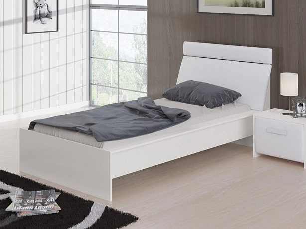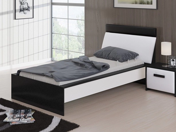 Стильная черно-белая кровать с наклонной спинкой. С обратной стороны спинка усилена ребрами жесткости. Каркас кровати выполнен из ЛДСП, а мягкая вставка на изголовье обита экокожей класса "Люкс".