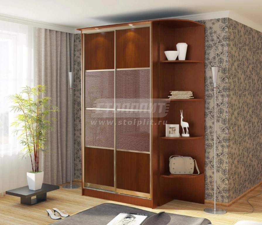 Шкаф 2-х дверный «СБ-1082БП» воплощает в себе сочетание комфорта и изящества. Данная модель обладает большой вместительностью: кроме закрытых секций присутствует торцевой пенал с четырьмя открытыми полками. Шкаф оборудован стеклянным фасадом с нежным рисунком, а также имеет верхнюю подсветку. Шкаф выполнен в актуальном цвете «Яблоня локарно».