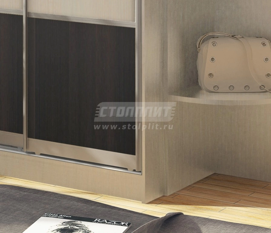Большой и просторный шкаф-купе, с элегантным дизайном, станет для вас идеальным помощником для хранения вещей. Шкаф-купе сочетает в себе все качества полноценного шкафа, но занимает меньше места, за счет раздвигающихся дверей, на которых очень удачно расположены зеркала. Удачно подобранные цвета шкафа подойдут для самых креативных квартирных проектов.