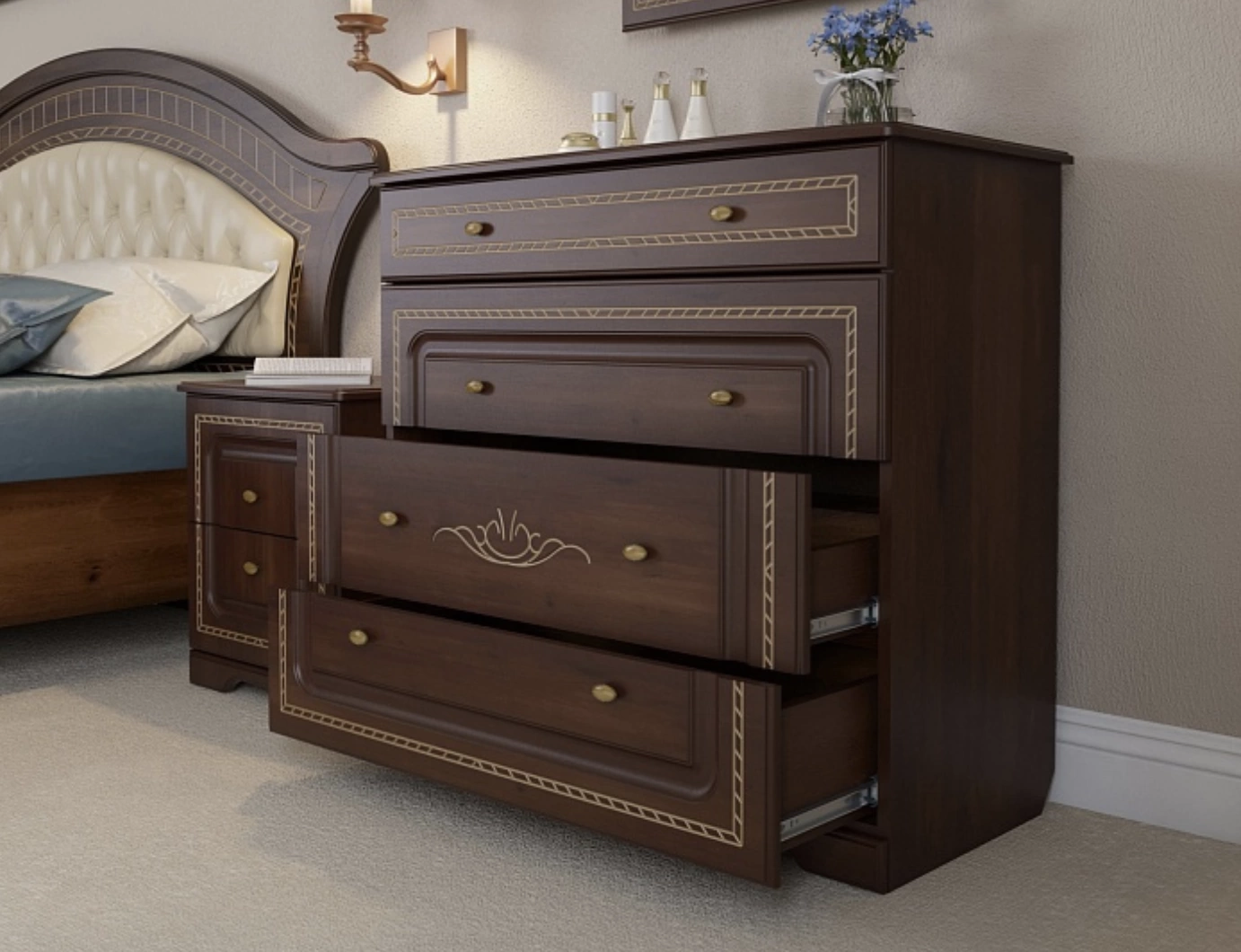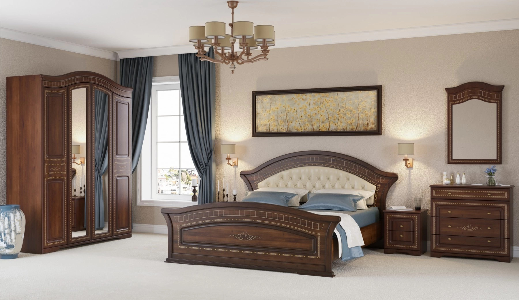 Фасады спальни "Диана", покрытые лаками, красками и патиной ручной работы - это настоящий шедевр, проверенный временем в Европе и дошедший до наших дней. Технология производства фасадов является разработкой итальянских мастеров 19-го века. Фасады точно передают внешний вид и текстуру натурального дерева. Основой фасада служит экологически чистый МДФ, покрытый патиной ручной работы для получения знаменитого в традиционной классике эффекта старения!
