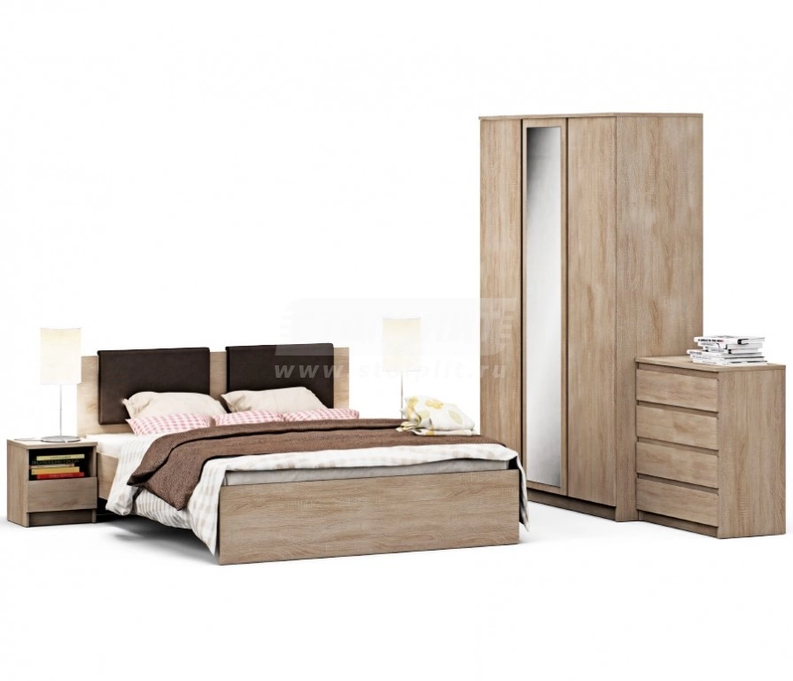 Набор мебели для спальни Веста украсит любую комнату. Размеры предметов мебели универсальны и подойдут для большого или среднего по размерам помещения. Спальня выполнена в цвете Дуб Сонома, который создает необходимую для отличного отдыха атмосферу гармонии и спокойствия. Её приятный дизайн будет каждый день дарить вам радостные эмоции. В набор мебели Веста входят: кровать, прикроватные тумбы, вместительный комод, трехстворчатый шкаф с зеркалом. Данный комплект включает в себя: