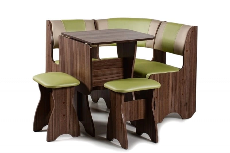 Особенности уголка: С этим набором Вы легко организуете обеденную зону даже в самом небольшом пространстве. Диван имеет два вместительных ящика для хранения различных вещей. Столешница покрыта термостойким пластиком. Влагостойкие ножки. Размеры: Размер угловой скамьи: ш(1000х1000)хг500хв850 мм. Размер стола: ш625(1000)хг580хв750 мм. Размер табурета: ш380хг290хв460 мм. Уголок универсален - собирается как в левом, так и в правом исполнении.