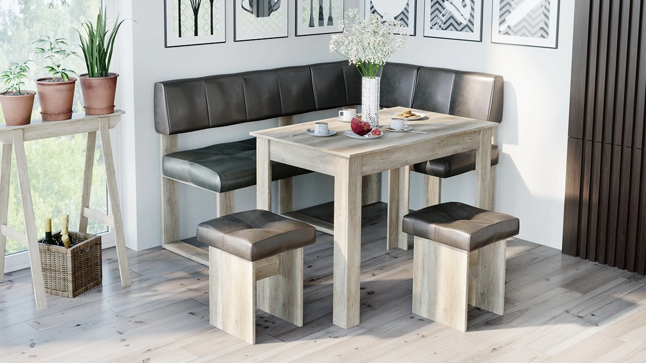 - Обеденная зона "Мадрид №1" состоит из удобной угловой скамьи, практичного стола и компактных табуретов.