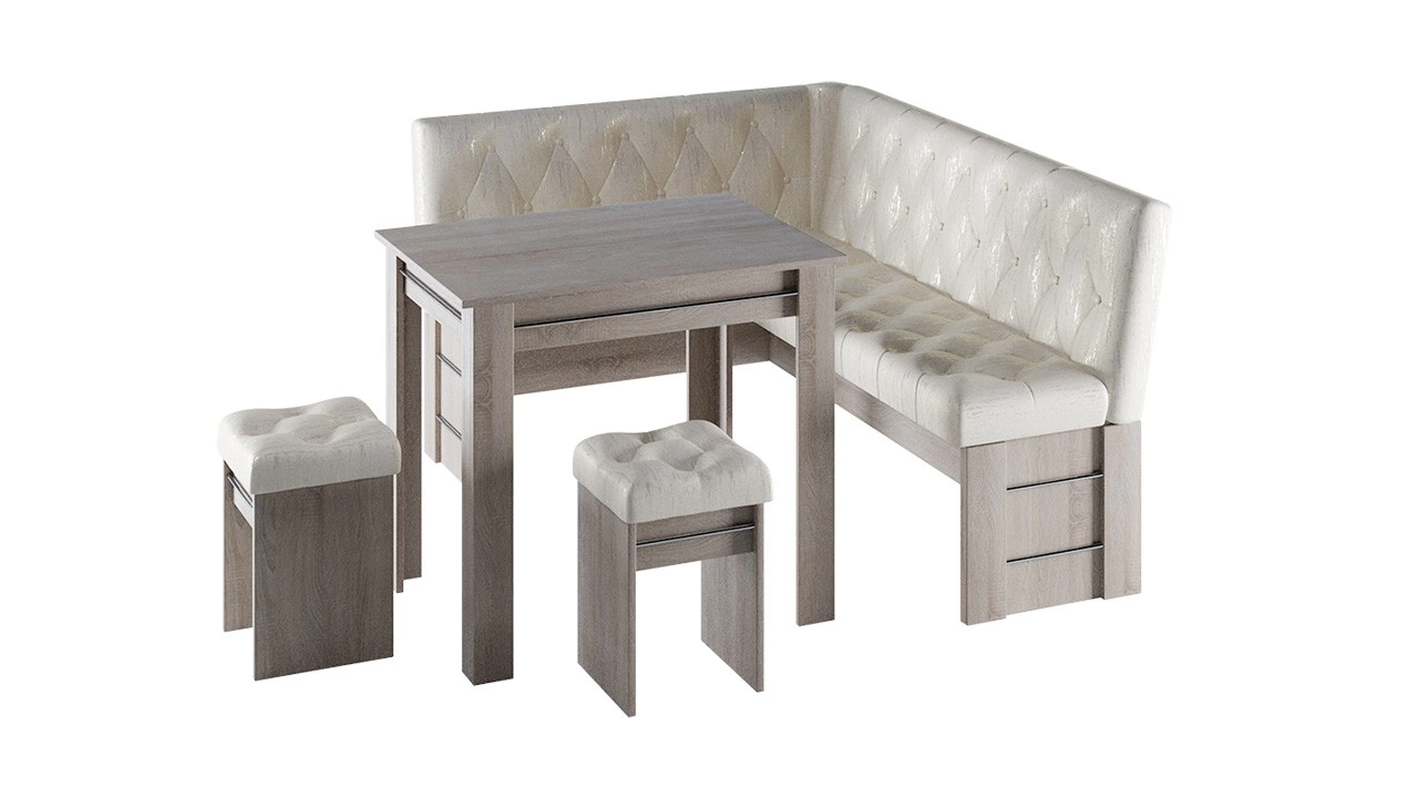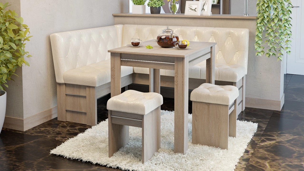 - Обеденная зона "Памела" состоит из удобной угловой скамьи, практичного стола и компактных табуретов.