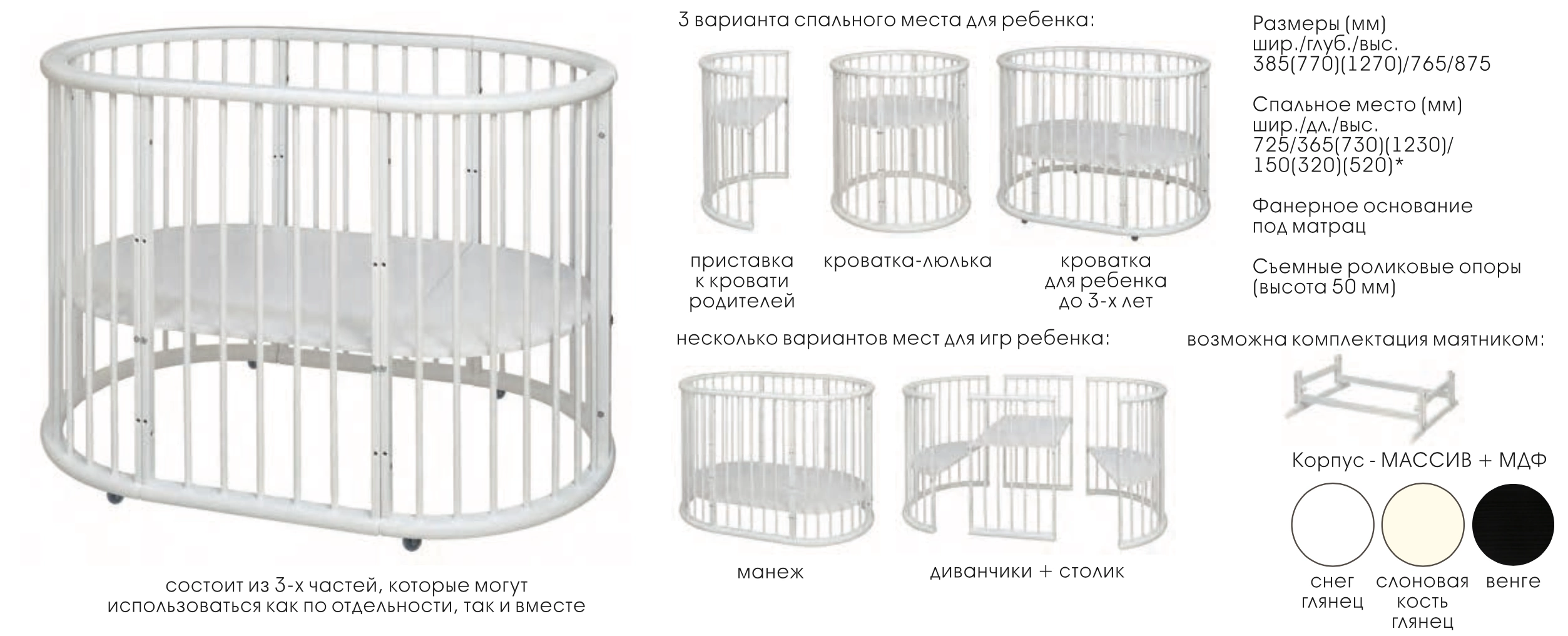 Кровать состоит из 3-х частей, которые могут использоваться как по отдельности, так и вместе. Боковые части могут использоваться в качестве спального места для ребенка (1 боковая часть - приставка к кровати родителей, 2 боковые части, соединенные вместе - кроватка-люлька), а также в качестве диванчика/столика для игр. Центральная часть может использоваться в качестве столика. Все части, соединенные вместе, могут использоваться в качестве кроватки для ребенка до 3-х лет, а также в качестве манежа (нижнее положение основания под матрац).