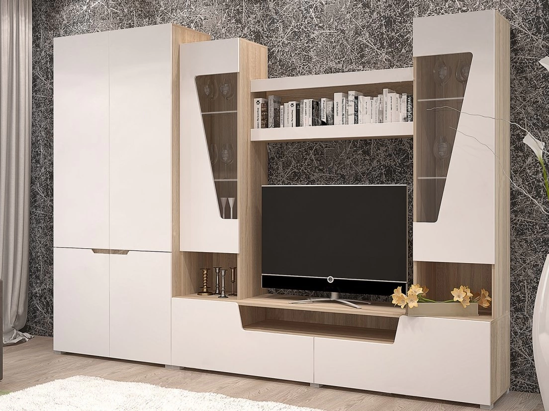 - Набор состоит из 2х ств. шкафа, тумбы, надстройки с витринами. Гостиную можно доукомплектовать комодом и подсветкой стеклополок.