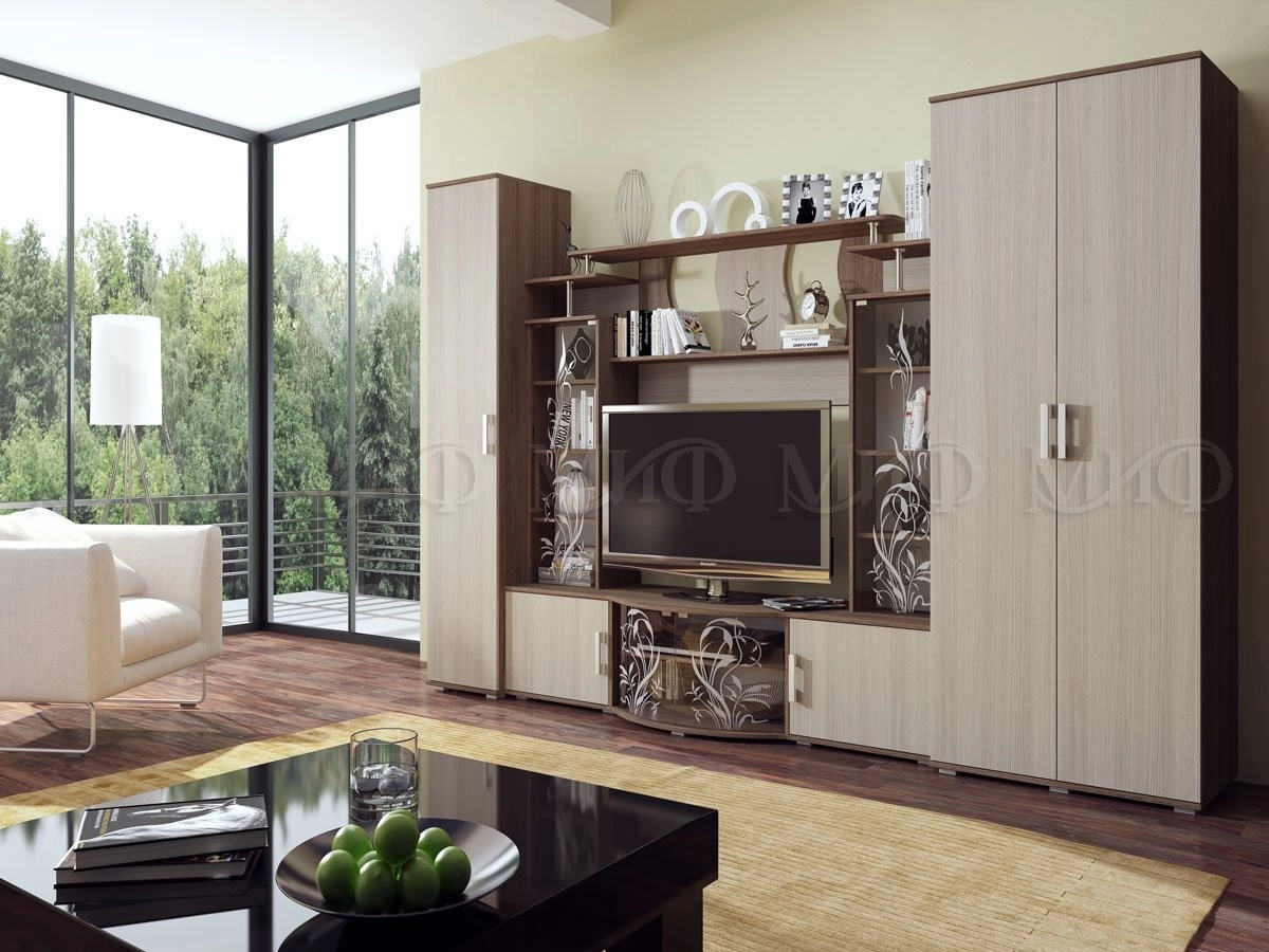 Актуальная модульная система для гостиной, с большой нишей под TV. Стеклянные дверцы стеллажей декорированы растительным узором. Роскошный вариант для стильного интерьера.
